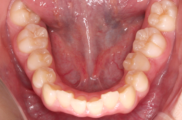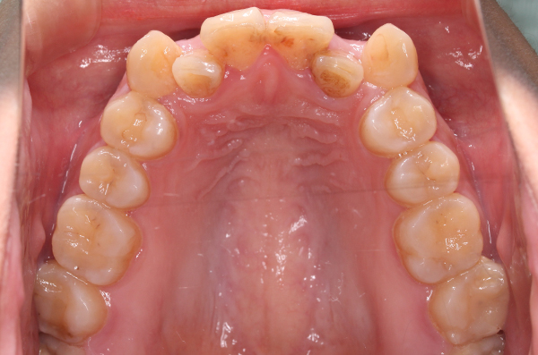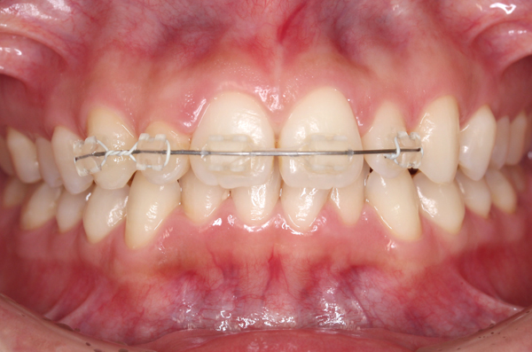 右上下1がクロスバイトの為、上顎の数本にブラケットを装着し、部分的な反対咬合を改善(約4〜6ヶ月)