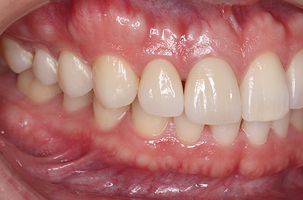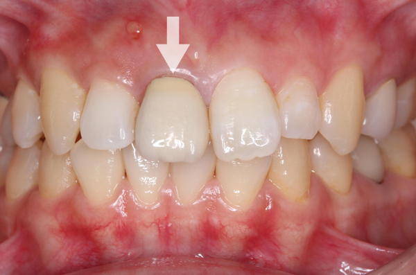 右上1に陶材が入っている患者さん。やや前方に出ているのが気になる為、一度外して根の治療をし、土台(ファイバーポスト)にて歯軸を修正。その後e.max(レイヤリング)を装着した。