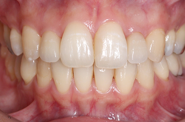 歯の黄ばみと左上1のレジン前装冠が気になる患者さん。初期治療でステインを除去(PMTC)した後にホームホワイトニングにて自分の歯を白くし、その後オールセラミックを装着した。ホワイトニングは後戻りすることがあります。